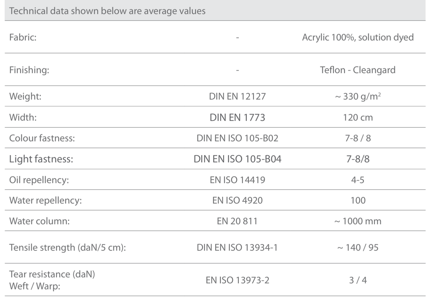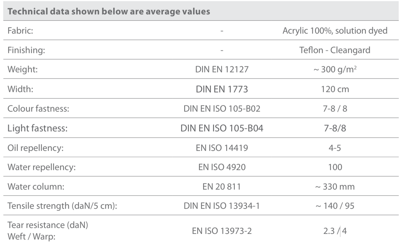 Akrylstoffer garanterer produktets høyeste kvalitet, og gir termisk komfort og beskyttelse mot UV-stråling. Laget 100 % av akrylfiber, farget i en kjemisk løsning, og gir utmerket beskyttelse mot fargetap. UV-motstandskoeffisienten er 7–8 ved 8° skala. Impregnering med TEFLON®- eller SCOTCHGARD™-midler gir en utmerket beskyttende barriere og styrker stoffets vannavvisende egenskaper, og forhindrer også at smuss fester seg. Motstand mot lekkasje: 330 mm vannsøyle. Fordelen med akrylstoff er også høy motstand mot strekk og riving. Luftgjennomtrengelighet og vannavvisning. Piktogrammene ovenfor gjelder akrylstoffer.